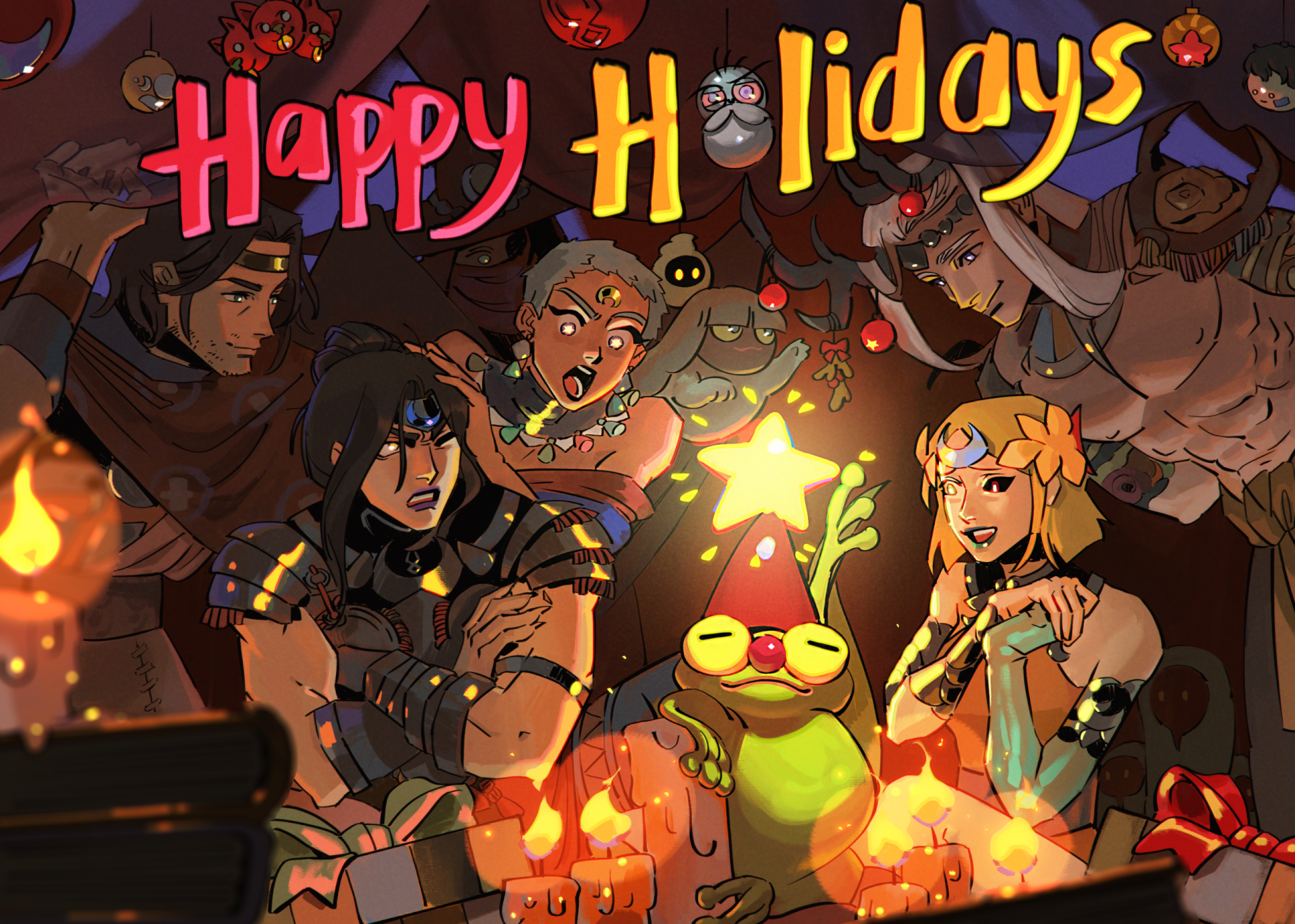 Featured here are some of the familiar faces from the Crossroads, under more-festive circumstances than those that Princess Melinoë finds herself in at the beginning of the game. Illustration by our environment artist Joanne Tran.